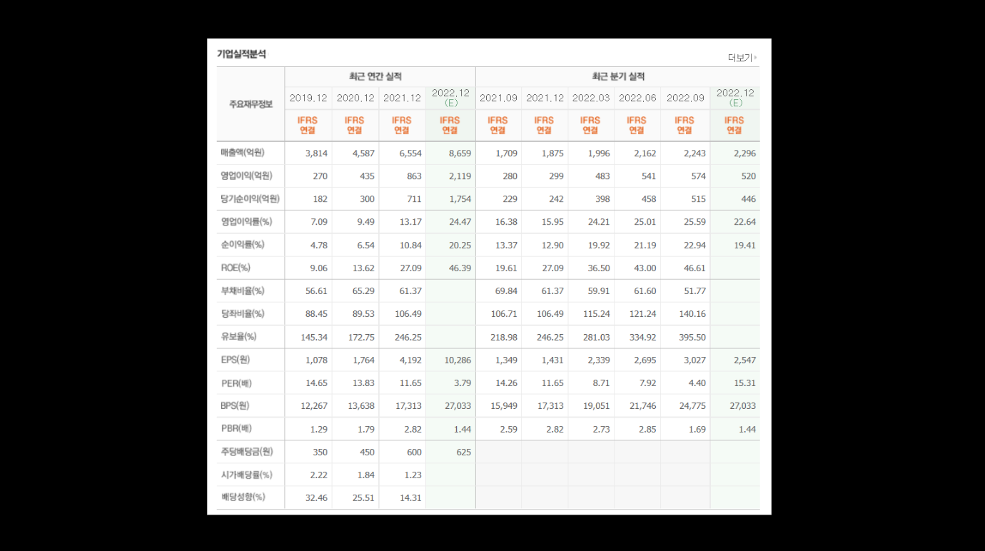 내년과 내후년에는 경기침체로 인한 수요 둔화로 이익이 줄 것으로 예상되지만 당장의 지표만 본다면 PER = 3.7에 PBR=1.4 수준입니다.
