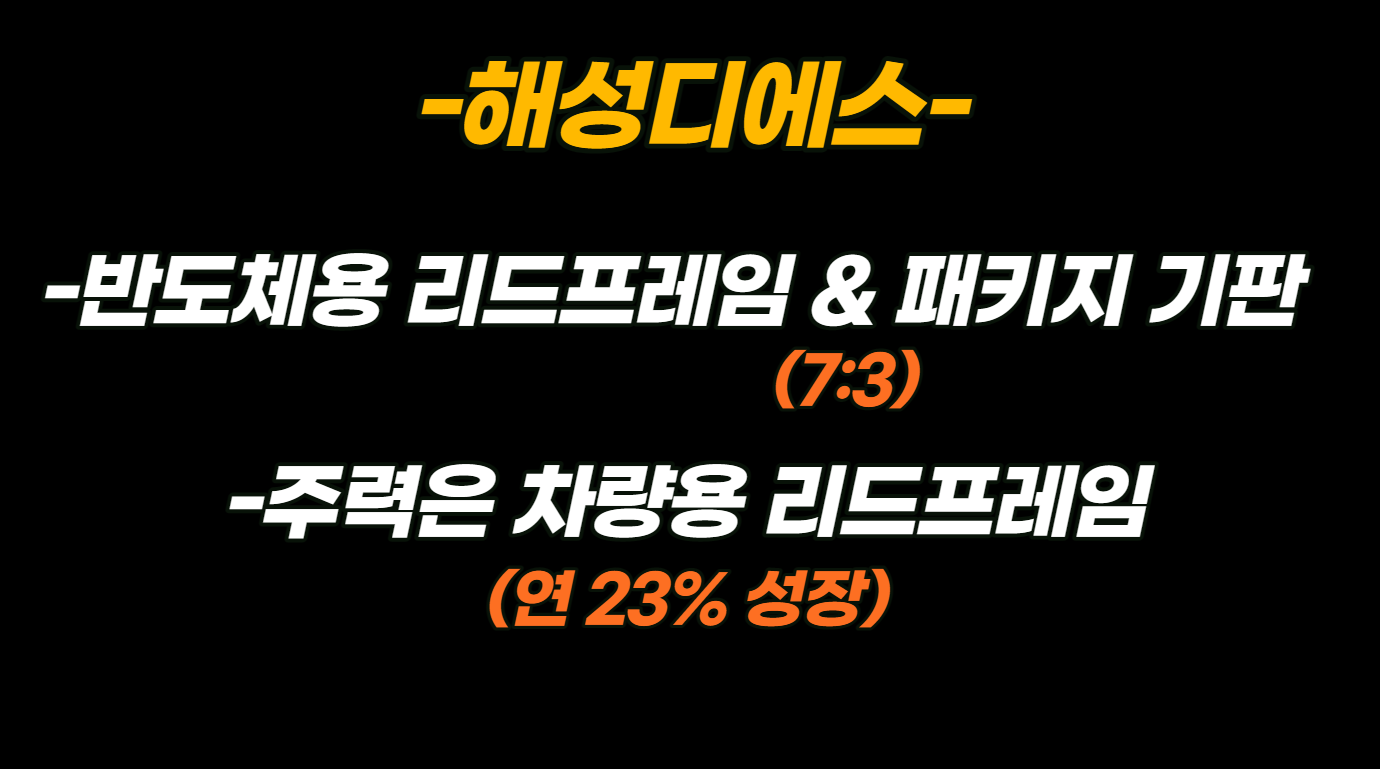 해성디에스는 반도체용 리드프레임과 패키지기판을 주로 생산하는 기업입니다.