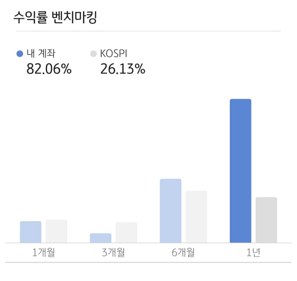 제가 최근 1년간 거둔 주식수익률입니다. 코로나로 인한 찬스를 잘 살려 좋은 수익률을 기록할 수 있었습니다. 1개월과 3개월 수익률은 코스피 수익률보다 못하네요 ^^;