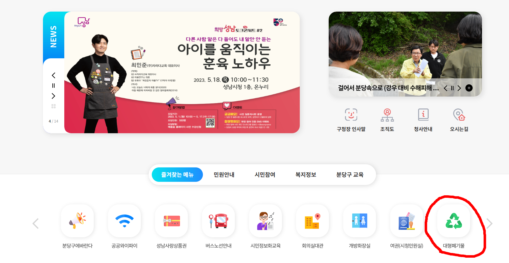 메인 화면에 위의 사진처럼 대형폐기물 메뉴가 있는 경우가 많으며, 없을 때는 검색어에 대형폐기물을 검색해 줍니다.