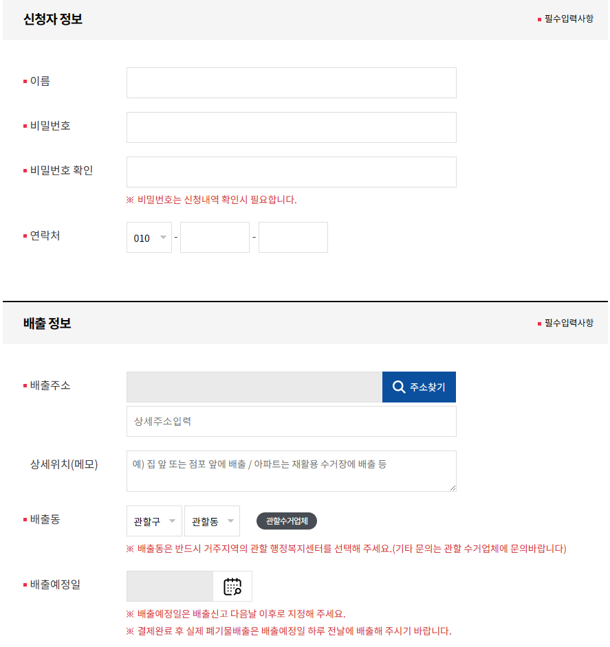 간단한 개인정보와 배출할 곳의 주소지 등을 입력해 줍니다.