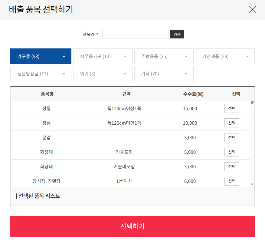품목에 따라 발생하는 비용이 다르며 비용이 없는 품목들도 존재합니다.
