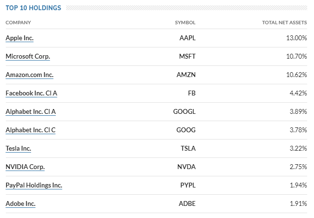 QQQ의 TOP10 종목입니다. 기술주 위주로 구성된 나스닥입니다. 하지만 최근에 워낙 기술주들의 강세로 인해 TOP10 종목은 S&P 500과 크게 다르지가 않습니다.