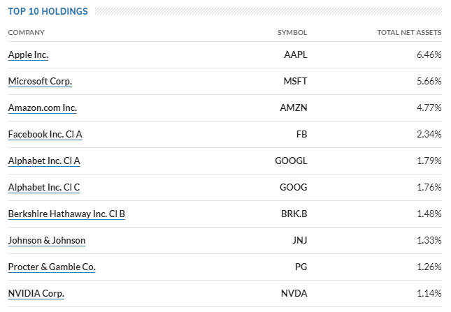 현재 SPY가 보유하고 있는 TOP10 종목입니다. 애플, 마이크로소프트, 아마존 등 기술주들이 많은 편이고 버크셔 헤서웨이나 존슨&존슨 등도 눈에 보이네요.