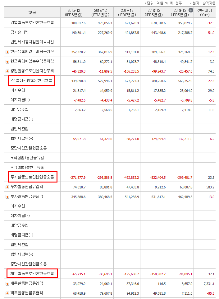 2. 투자활동으로인한현금흐름은 벌어들인 돈으로 재투자를 얼마나 했는지를 나타냅니다.