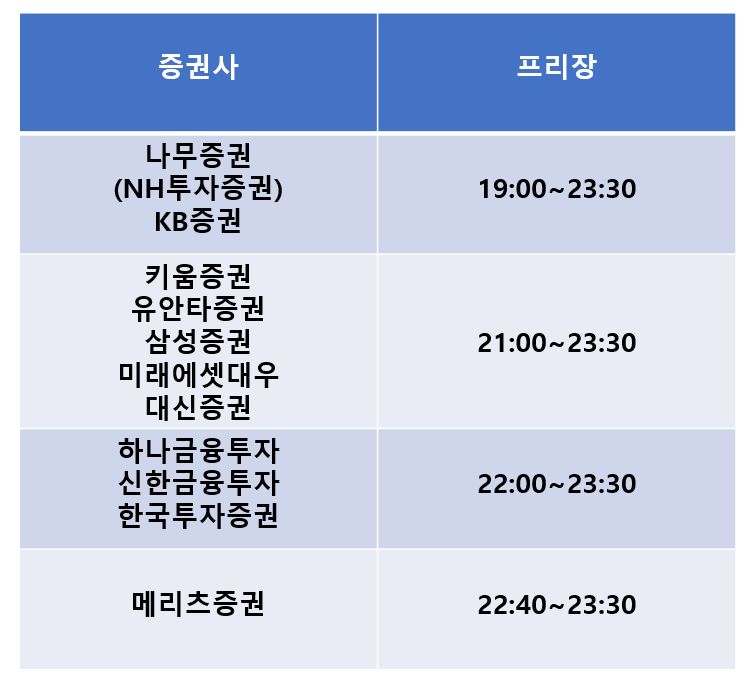 한국 시간으로 18:00 PM~23:30PM에 프리장을 이용할 수 있지만 모든 증권사가 동일한 시간에 이용을 할 수 있는 것은 아닙니다.