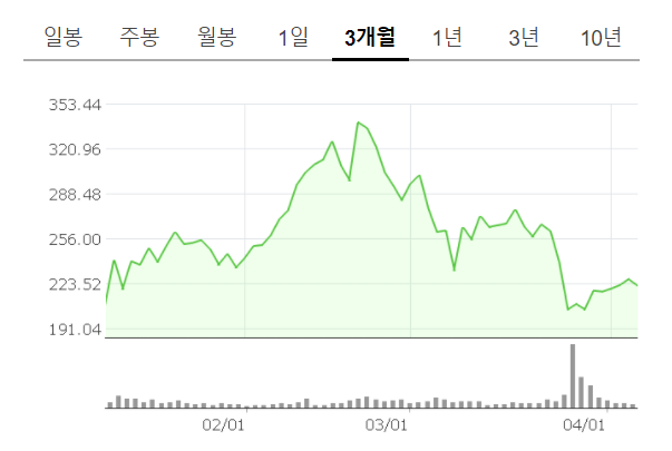 220불 근처에 있던 주가가 급등해서 320불을 돌파하더니 다시 제자리로 돌아온 모습입니다.