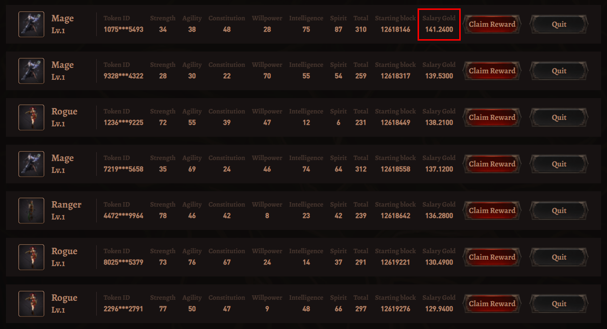 제가 알바를 보내놓은 캐릭터들이고요. 오른쪽에 빨간색으로 표시된 것이 벌어온 Gold입니다.