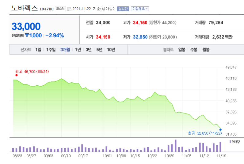 최근 노바렉스의 주가 흐름이 안 좋습니다. 고점 대비 약 35%나 하락한 상황입니다. 매출은 나름 괜찮았지만 수익성이 좀 악화된 것이 악재로 작용한 것 같습니다.